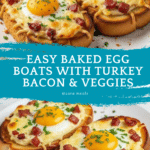 This delicious Baked Egg Boats recipe features crusty bread hollowed out and filled with a savory mixture of turkey bacon, sautéed vegetables, fresh spinach, and a blend of cheeses bound together by fluffy baked eggs. Perfect for breakfast or brunch, these egg boats are flavorful, satisfying, and easy to customize with your favorite fillings.