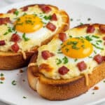 Two thick slices of toasted bread act as the base, with crispy, browned edges and a soft, golden interior. Each slice is filled with a layer of melted, creamy cheese mixed with small bits of cooked bacon, topped with a bright, whole egg yolk nestled in the center. Chopped green herbs are sprinkled on top, adding specks of fresh color. The dish sits on a clean white plate, placed on a white marbled surface, with some crumbs and herbs scattered lightly around. photo taken with an iphone --ar 4:5 --v 7