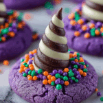 These Best Witch Hat Halloween Cookies combine classic peanut butter cookies with festive purple coloring and a chocolate kiss on top, making them a perfect treat for Halloween celebrations. The chewy, soft cookies are decorated with Halloween sprinkles or purple sanding sugar for a spooky and colorful touch.