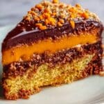 A close-up of a slice of cake on a white plate shows three distinct layers. The bottom layer is thick and golden brown with a soft, slightly crumbly texture. The middle layer is a smooth, bright orange filling. The top layer is dark, glossy chocolate with small bright orange pieces sprinkled on top, adding a textured look. The cake edges show a mix of crumbs and chocolate, highlighting its rich and moist appearance. The background is a white marbled texture. Photo taken with an iphone --ar 4:5 --v 7
