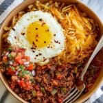 The dish is in a round bowl with a light brown color, sitting on a white marbled surface with a striped cloth underneath. It has four main layers: on the right side, there is a thick layer of cooked ground meat in a reddish sauce with visible chunks of green and red peppers; directly to the left, there is a heap of crispy golden-brown shredded potatoes; next to that, in the center, there is a colorful scoop of diced tomato salsa with green herbs and white onion bits; on top, slightly overlapping the salsa and hash browns, there is a sunny-side-up fried egg with a bright yellow yolk, white edges, and small black and red chili flakes scattered on it. A silver fork is partly embedded in the meat layer on the right. photo taken with an iphone --ar 4:5 --v 7