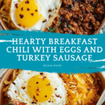 A hearty and flavorful Breakfast Chili and Eggs recipe featuring turkey sausage, smoky bacon, fire roasted tomatoes, and a rich blend of chili seasoning simmered together to create a comforting morning meal.