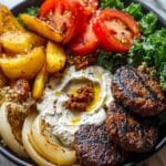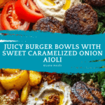 Burger bowls with caramelized onion aioli offer all the delicious flavors of a classic burger without the bun. This dish is fresh, satisfying, and packed with savory beef, crisp vegetables, and a rich, sweet aioli that elevates every bite.