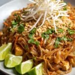 A vibrant and flavorful Chicken Pad Thai recipe featuring tender rice noodles, juicy chicken breast, and a tangy-sweet sauce, garnished with fresh bean sprouts, peanuts, cilantro, and lime wedges. This classic Thai stir-fry is perfect for a quick and satisfying weeknight meal.