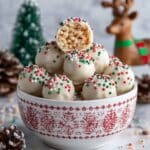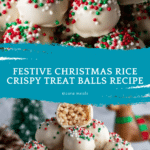 These festive Christmas Rice Crispy Treats are bite-sized balls made from puffed rice cereal and melted marshmallows, coated in creamy white chocolate, and adorned with colorful holiday sprinkles. Perfect as a fun and easy holiday treat to share at parties or gift to friends and family.