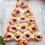This Christmas Tree Cream Cheese Danish is a festive and easy last-minute breakfast treat that’s perfect for holiday mornings. Fluffy crescent roll dough is filled with a sweet cream cheese mixture and cherry pie filling, then baked to golden perfection. A simple glaze finishes it off, making it as beautiful as it is delicious.