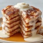 - Serve: Stack the cinnamon roll pancakes and generously drizzle or spoon the cream cheese glaze over them. Optionally, dust with powdered sugar or sprinkle nuts for added texture and flavor.