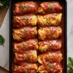12. Garnish and Serve: Remove the cabbage rolls from the oven. Sprinkle chopped parsley over the top for a fresh garnish. Serve the cabbage rolls warm for a satisfying meal.