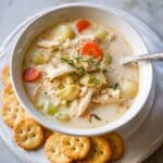 A white bowl filled with creamy chicken and vegetable soup sits on a white plate scattered with round, golden oyster crackers. The soup has several visible layers: shredded light brown chicken, thin slices of bright orange carrots, pale green celery pieces, and small off-white pasta shapes, all in a creamy white broth. A fresh sprig of green thyme rests on top, and a silver spoon is partially dipped into the soup, leaning against the bowl's edge. The scene is set on a white marbled surface. photo taken with an iphone --ar 4:5 --v 7
