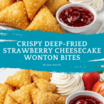 Keywords: Strawberry cheesecake, wonton bites, deep-fried dessert, strawberry jam, cream cheese dessert, crispy wontons, sweet snacks