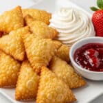 These Deep-Fried Strawberry Cheesecake Stuffed Wonton Bites are crispy, golden pockets filled with a creamy strawberry cheesecake filling. They make a delightful dessert or snack, combining the richness of cream cheese and the sweet tang of strawberry jam inside a crunchy wonton wrapper. Served warm with whipped cream, extra strawberry jam, and fresh strawberries, they are perfect for parties or a fun treat any time.