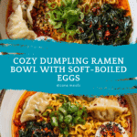 Keywords: dumpling ramen bowl, instant ramen, soft boiled eggs, chicken broth soup, easy ramen recipe, Asian soup, quick dinner