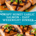 This Easy Crispy Honey Garlic Glazed Salmon recipe features perfectly seared salmon fillets topped with a sweet and savory honey garlic glaze. The salmon is cooked skin-side down in a skillet until golden and crispy, then finished with a flavorful glaze and garnished with fresh green onions. It’s a quick, delicious meal perfect for busy weeknights.