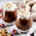 Two clear glasses filled with three layers: the bottom layer is a smooth, dark brown chocolate mousse, the middle layer is slightly lighter brown mousse with a creamy texture, and the top layer is light whipped cream sprinkled with small crumbles of brown cookie. The glasses sit on a white marbled surface scattered with frosted red cranberries and brown gingerbread cookies shaped like men. The background is softly blurred with a light, neutral tone. Photo taken with an iphone --ar 4:5 --v 7