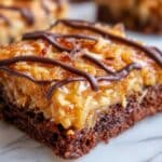 Easy Samoa Brownies combine rich, fudgy brownies with a delicious toasted coconut and caramel topping, finished with a drizzle of melted chocolate for a decadent, layered treat inspired by the classic Girl Scout cookie flavor.