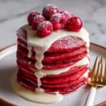 Delight your Valentine’s brunch with these fluffy, vibrant red velvet pancakes topped with a luscious cream cheese glaze. Combining a rich cocoa flavor with a hint of vanilla and the striking red hue, these pancakes are perfect for a special breakfast or brunch that impresses and satisfies.