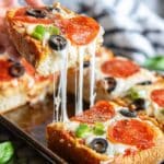 - Serve: Once baked, take the bread pizzas out of the oven. Cut each half into 5 slices or desired size and serve immediately while hot and cheesy.