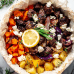 Kleftiko is a traditional Greek slow-roasted lamb dish, baked to tender perfection with hearty vegetables like potatoes, carrots, bell peppers, and onions. The lamb is seasoned with fragrant herbs like rosemary, thyme, and coriander, then cooked wrapped in parchment paper and foil to lock in moisture and flavor. An optional touch of lemon juice and feta cheese adds brightness and creaminess, making this dish a comforting and aromatic centerpiece perfect for a special meal.