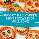 Keywords: Halloween mini pizzas, spooky pizza recipe, ghost pizza, mummy pizza, jack-o-lantern pizza, Halloween snacks, kids party food