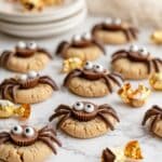 These Halloween Peanut Butter Spider Cookies are a fun and festive treat perfect for spooky celebrations. Soft peanut butter cookies topped with mini Reese’s Peanut Butter Cups become creepy-crawly spiders with chocolate legs and candy eyes, making them a delightful and festive dessert for all ages.