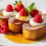 This Hawaiian Roll French Toast recipe is an indulgent and fun breakfast treat featuring sweet, soft Hawaiian rolls soaked in a rich custard blend of eggs, milk, cream, and warm spices. Cooked to golden perfection in a skillet, this French toast offers a delightful combination of fluffy texture and sweet flavor, perfect for serving with classic toppings like maple syrup, berries, whipped cream, and nuts.