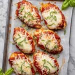 The image shows six baked chicken breasts on a metal baking tray lined with parchment paper, each topped with a layer of bright red tomato sauce and a thick, melted layer of white mozzarella cheese. The cheese looks gooey and slightly browned around the edges, with small bits of green chopped basil sprinkled on top for garnish. The chicken breasts are golden brown around the sides where cheese and sauce have melted and crisped. The tray is on a white marbled surface with a few fresh basil leaves scattered around the corner. Photo taken with an iphone --ar 4:5 --v 7