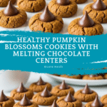 These Healthy Pumpkin Blossoms are soft, subtly spiced cookies made with pumpkin purée and sweetened with pure maple syrup. Each cookie is topped with a melty dark chocolate kiss, creating the perfect balance of fall flavors and chocolatey delight in a wholesome treat suitable for a cozy autumn snack.
