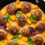 A black round pan filled with about twelve golden-brown meatballs that have a slightly crispy texture on top, mixed with bright yellow bell pepper chunks scattered throughout. The meatballs and peppers rest in a creamy light orange sauce that pools lightly around them. Fresh green herbs are sprinkled across the dish, along with a few purple edible leaves placed on top. The pan is set on a smooth white marbled surface, with a hint of another wooden bowl containing yellow items in the upper right corner, and part of a white bowl with coarse salt in the lower right. photo taken with an iphone --ar 4:5 --v 7