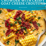 Keywords: sun dried tomato chowder, corn chowder recipe, creamy corn soup, goat cheese croutons, fall soup recipes, cozy dinner ideas