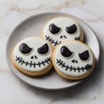 4. Decorate: Divide the royal icing into two portions. Tint one portion with black food coloring until an even deep black color is achieved. Transfer both the white and black icings into piping bags. Decorate the cooled cookies to resemble Jack Skellington’s face by piping the eyes, nose, mouth, and facial expression. Allow the icing to dry completely at room temperature before serving or storing to prevent smudging.