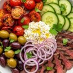 - Assemble Bowl: In serving bowls, layer your choice of cooked grains or cauliflower rice, then add slices of the cooked steak. Top with cherry tomatoes, diced cucumber, sliced red onion, kalamata olives, feta cheese, and chopped fresh herbs. Drizzle the bowl generously with the prepared tzatziki and lemon vinaigrette dressing. Serve immediately and enjoy a fresh Mediterranean feast.