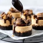 The image shows five small round cheesecakes placed on a white parchment paper on a black wire rack, set on a white marbled surface. Each cheesecake has two layers: a thick dark brown base that looks like crushed cookies and a thick top layer of light tan peanut butter cheesecake with a smooth, slightly textured finish. The cheesecakes are topped with chopped pieces of chocolate peanut butter cups, which are brown with swirled peanut butter centers. In the center, a woman's hand is holding a black spoon above one cheesecake, pouring shiny, dark chocolate sauce that flows down the sides, creating glossy drips. The background is blurred white, keeping the focus on the cheesecakes. photo taken with an iphone --ar 4:5 --v 7