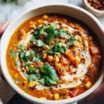 This Moroccan Spiced Lentil & Chickpea Soup is a hearty, flavorful dish featuring Mediterranean spices, red split lentils, chickpeas, and fresh vegetables. Enhanced with warm cumin, cinnamon, turmeric, and smoked paprika, it offers a comforting and nutritious meal topped with a zesty tahini dressing and fresh coriander.