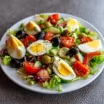 A classic French Niçoise Salad featuring tender baby potatoes, crisp green beans, ripe tomatoes, romaine lettuce, hard-boiled eggs, black olives, and flaky canned tuna, all tossed together with a bright and tangy lemon Dijon dressing. Perfect for a light, refreshing meal that showcases simple and fresh Mediterranean flavors.