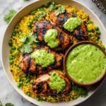 - Serve: Plate the fluffy turmeric rice, top with grilled or baked chicken, and drizzle generously with the creamy green sauce. Serve immediately to enjoy optimal flavors and textures.