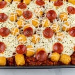 Keywords: pizza casserole, tater tot casserole, ground beef casserole, easy dinner, baked casserole, comfort food