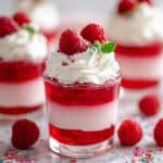 Bright and fun Raspberry Jello Cups featuring layered sweet raspberry Jello, creamy vanilla pudding, and whipped cream, garnished with fresh raspberries and mint leaves. A perfect cold dessert for Valentine’s Day parties or any festive occasion that’s easy to make and delightful to eat.