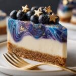 - Combine and Swirl: Pour the cheesecake batter over the cooled crust in the springform pan. Spoon the cooled blueberry swirl over the top as ribbons. Using a knife or skewer, gently swirl the blueberry mixture into the cheesecake batter to create a galactic starry sky effect on the surface.