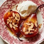 Delightfully tender Bosc pears roasted to caramelized perfection in a rich salted caramel sauce made with dark brown sugar, butter, and a hint of whiskey or bourbon. Toasted sliced almonds add a nutty crunch, making this elegant dessert perfect to serve warm with vanilla ice cream or heavy cream.