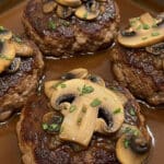 7. Simmer Patties and Mushrooms: Add the sliced baby Bella mushrooms and the previously cooked patties back into the skillet. Reduce heat to low and simmer gently for 7 to 10 minutes until mushrooms are tender and the gravy is rich and thickened.
