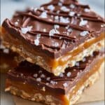 The image shows two thick, stacked dessert bars on a white marbled surface, each bar with four visible layers. The bottom layer is a light, crispy-textured base that looks like thin crackers or biscuits. Above that is a smooth, golden caramel layer, oozing slightly around the edges. On top of the caramel is a rich milk chocolate layer, glossy and even. The chocolate has dark chocolate drizzle lines crossing diagonally and is sprinkled with large, white sea salt flakes, adding texture and contrast. photo taken with an iphone --ar 4:5 --v 7