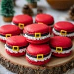 Santa Claus Macarons are festive treats perfect for the holiday season. With delicate red shells and charming royal icing decorations, these macarons combine a light, crisp texture with a creamy sugar cookie buttercream filling.