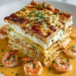 This decadent Shrimp Crab Lasagna combines tender seafood with creamy ricotta, mozzarella, and Parmesan cheeses layered between soft lasagna noodles, all baked in a rich Alfredo sauce. The dish is enhanced with garlic, chili flakes, and parsley for a flavorful, comforting Italian-American seafood feast perfect for special occasions or a luxurious family dinner.