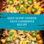 Keywords: slow cooker recipe, taco casserole, ground beef casserole, easy Mexican dinner, crockpot taco, weeknight dinner