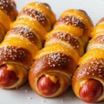 Soft Baked Cheesy Pretzel Dogs combine the classic flavors of a pretzel with melty cheddar cheese and a juicy hot dog inside. This irresistible treat is perfect for game days, parties, or a fun family snack. Crisp on the outside, soft and cheesy on the inside.