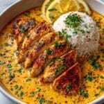 This Spicy Creamy Peri Peri Chicken features tender boneless chicken thighs seared to perfection and smothered in a velvety, flavorful peri peri cream sauce. Served over fluffy basmati rice, this dish balances smoky paprika, fiery chili flakes, and tangy lemon with the richness of cream cheese and heavy cream. Finished with crunchy shallots, fresh coriander, and charred lemon wedges, it’s a comforting yet vibrant meal perfect for spice lovers.