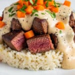 This hearty Steak and Queso Rice recipe combines tender seared sirloin steak with creamy melted queso cheese mixed into flavorful spiced rice and sautéed vegetables. Perfect as a satisfying one-pan meal, it features a blend of cumin, paprika, and chili powder for a mild southwestern flair.