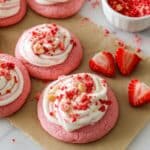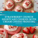 Delight in these Strawberry Crunch Shortcake Cookies featuring a moist strawberry cookie base topped with creamy vanilla strawberry frosting and a homemade strawberry crunch crumble for an irresistible texture and flavor combination.