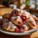 These strawberry scones are tender, buttery, and bursting with fresh fruit, making them a perfect treat for breakfast or afternoon tea. A sweet streusel topping and a delicate vanilla glaze add just the right amount of indulgence.