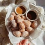 A white bowl lined with crinkled white paper holds about twenty small, sugar-coated, oval-shaped fried dough balls piled up closely. Near the back center of the bowl, a small white round dish is filled with two different dipping sauces side by side, one light brown and the other dark brown, creating a yin-yang swirl pattern. The bowl is held by a woman's hand resting on a creamy textured knitted fabric and a white marbled surface. Sunlight shines warmly from the top left, casting soft shadows and highlighting the granulated sugar on the dough balls. photo taken with an iphone --ar 4:5 --v 7